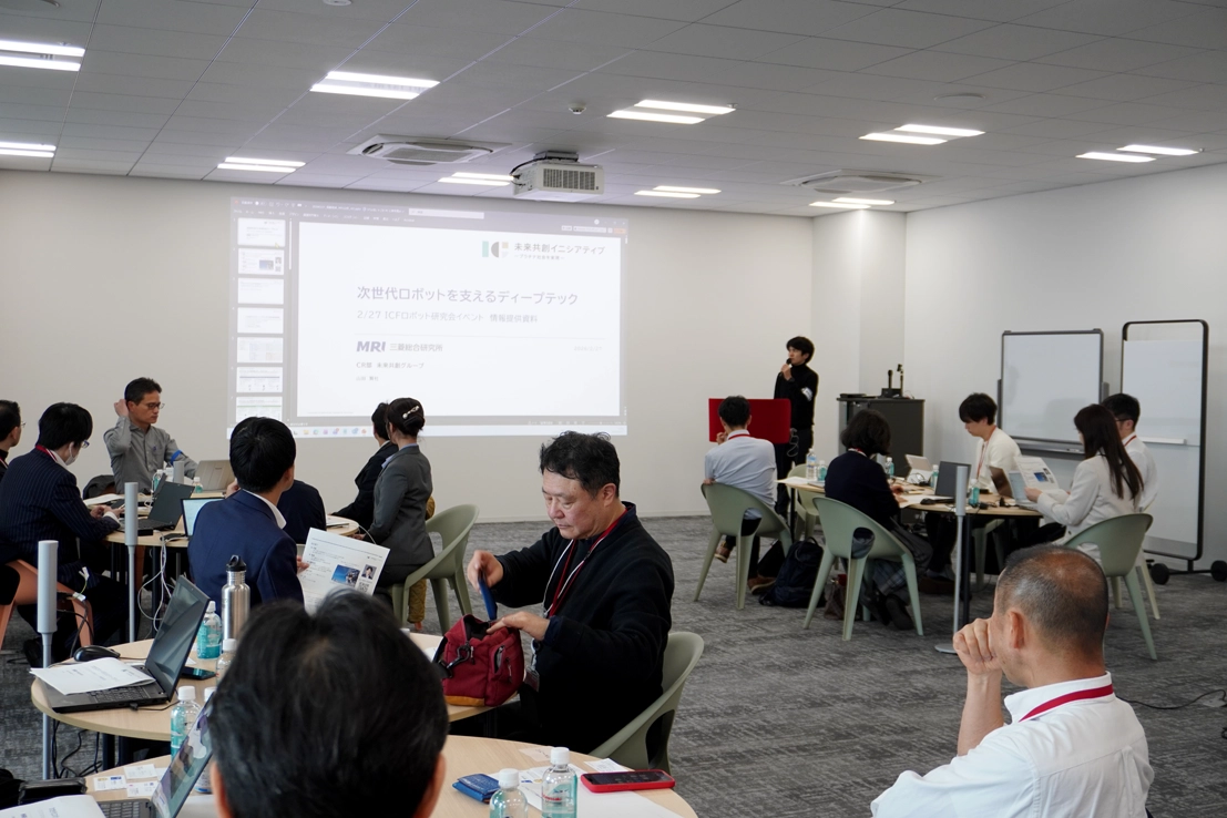 2026年2月27日、KAWARUBAにて三菱総合研究所様が推進する未来共創イニシアティブ(ICF)※1 ロボット研究会の第4回イベントを開催しました。「次世代ロボットを支えるディープテック」をテーマとした情報提供セッションの後、企業・自治体・研究機関など多様な参加者が、SF思考と社会的インパクト思考を掛け合わせながら、2040年の社会を見据えたロボット技術の社会実装や新たなビジネス・価値創出の可能性について議論しました。KAWARUBA見学や情報提供、ワークショップを通じて、分野や立場を越えた活発な意見交換が行われました。
